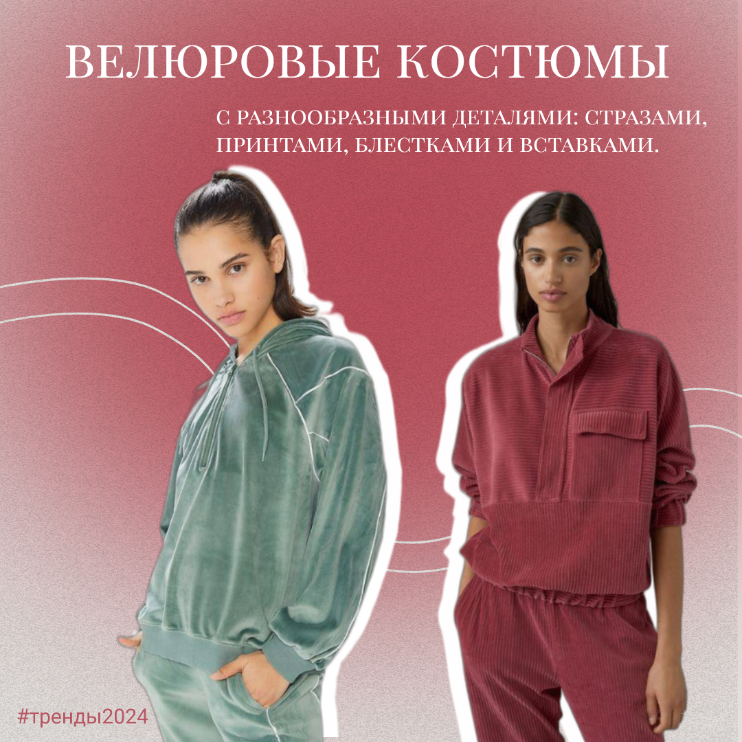 Вернулись в моду велюровые спортивные костюмы с разнообразными деталями: стразами, принтами, блестками и вставками. Этот тренд можно интерпретировать по-разному, выбрать только актуальную фактуру без декора, или совмещать верх и низ костюма в смешанных образах.