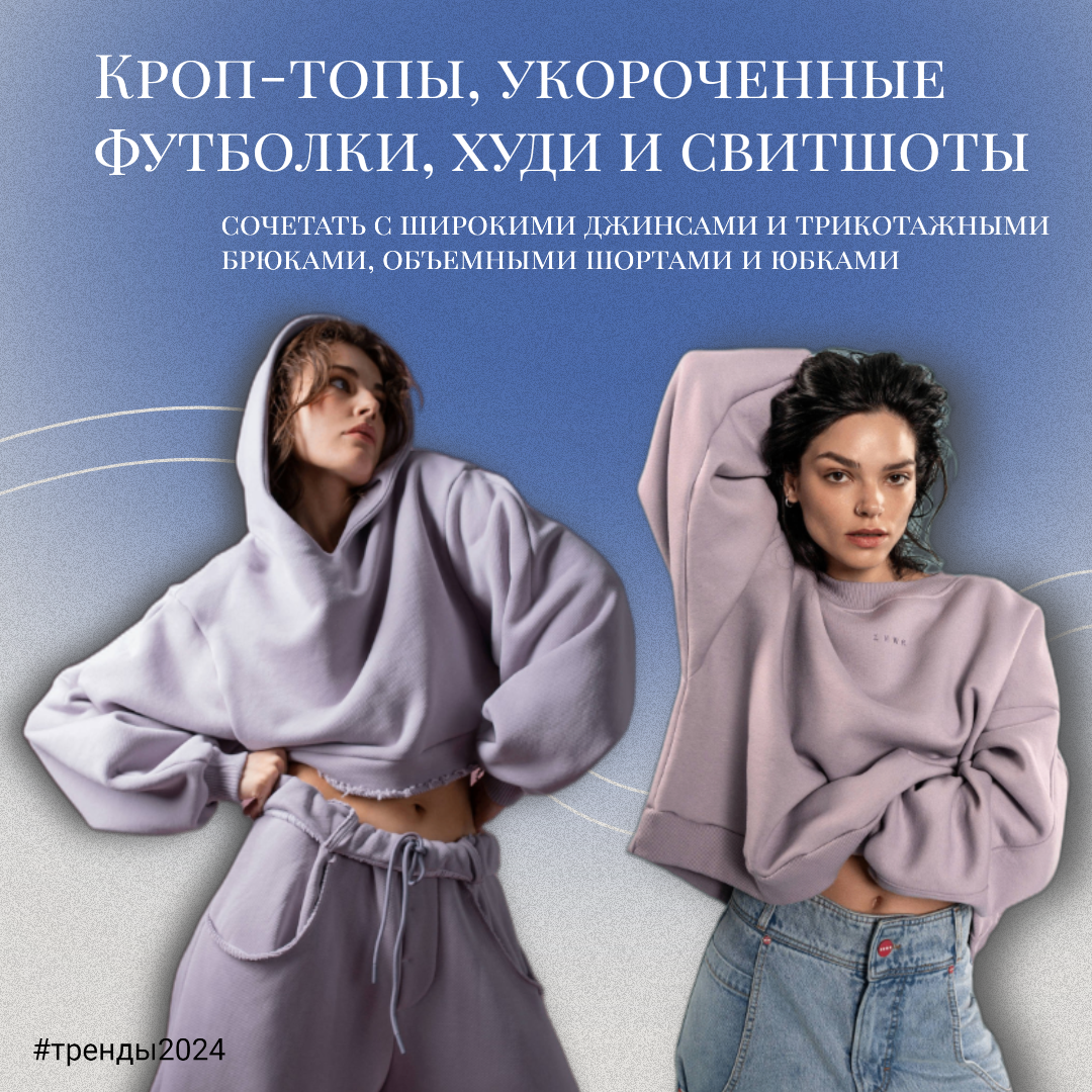 Кроп-топы, укороченные футболки, худи и свитшоты можно смело сочетать с любым низом – широкими джинсами и