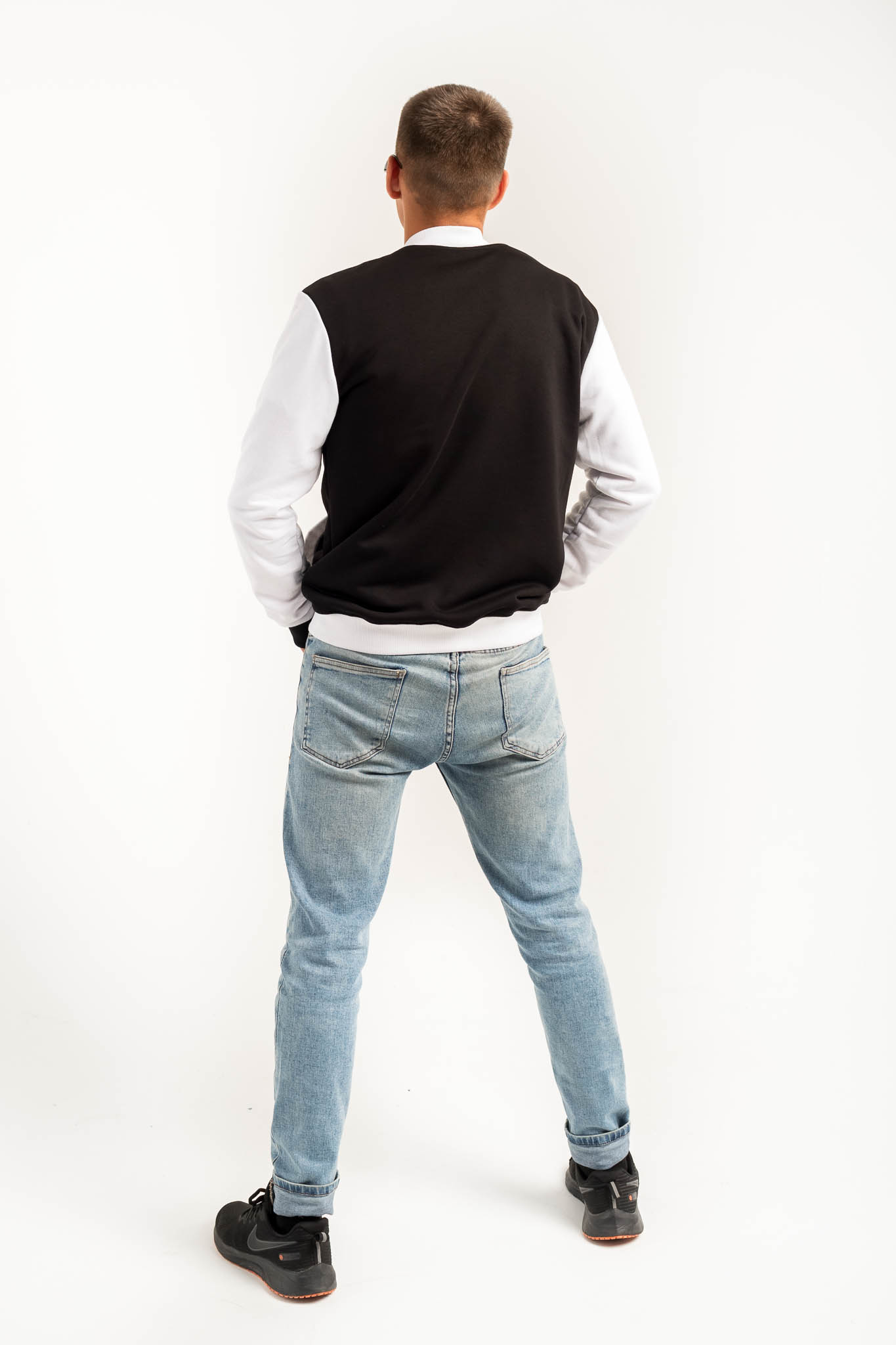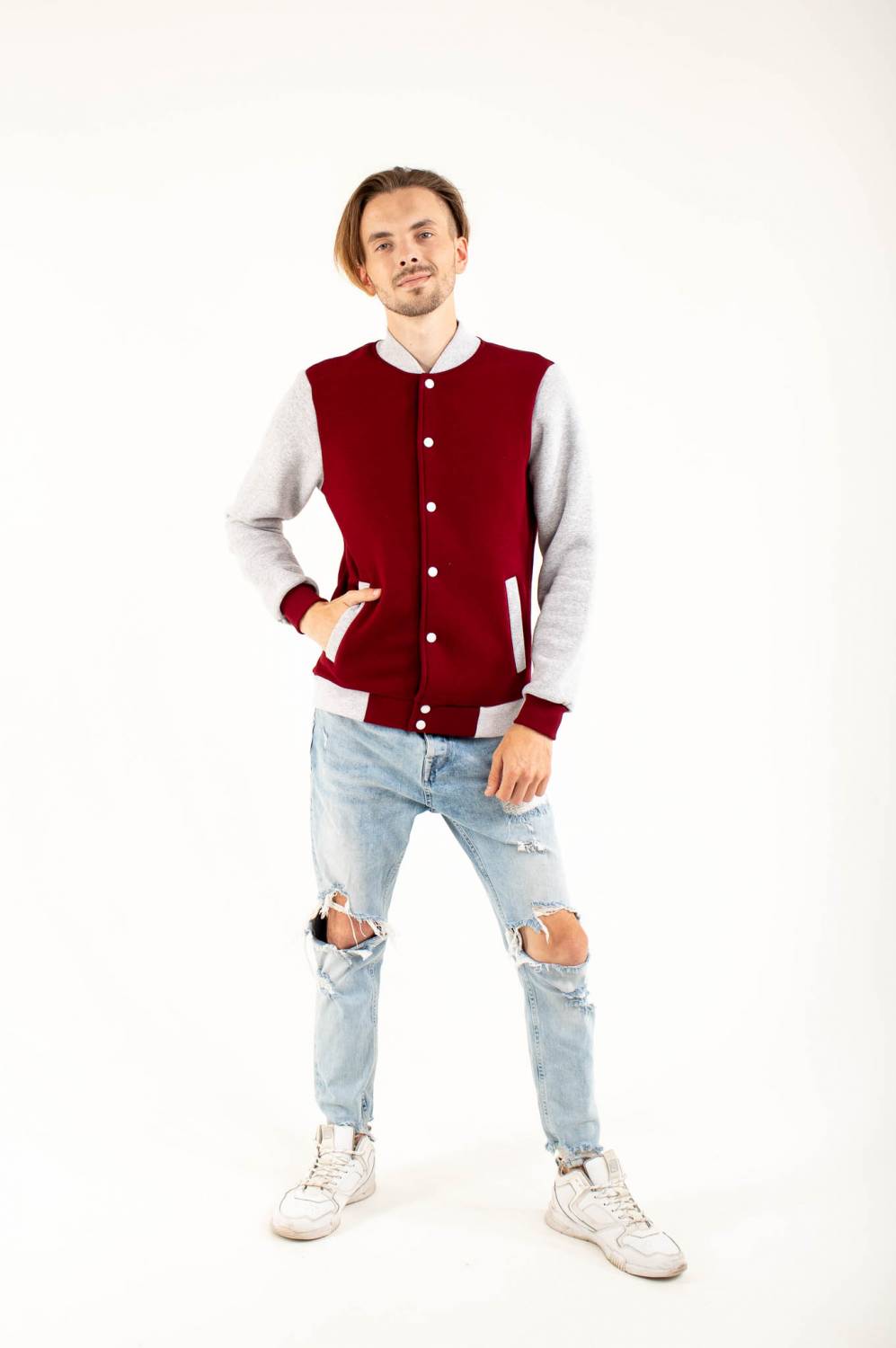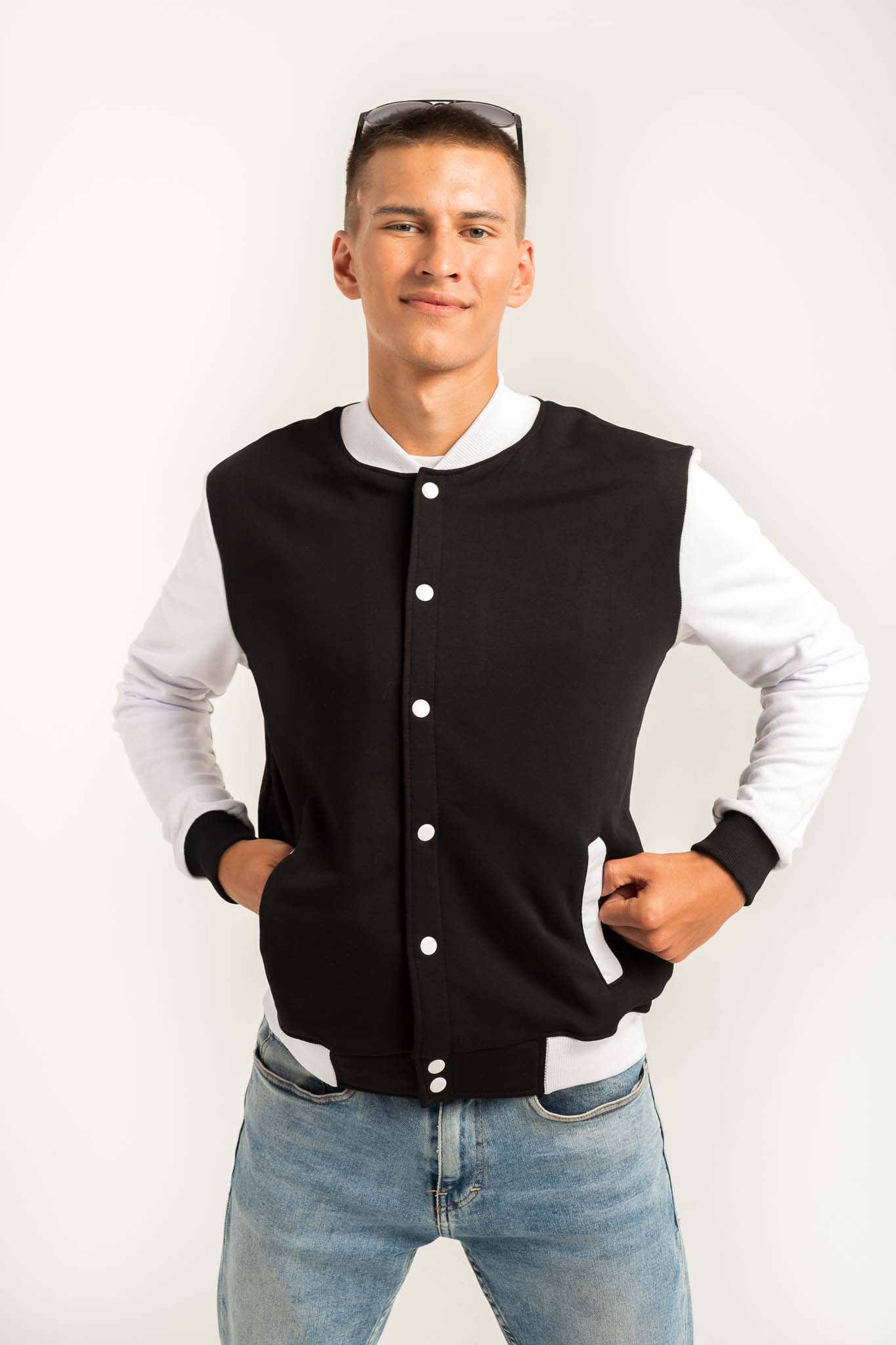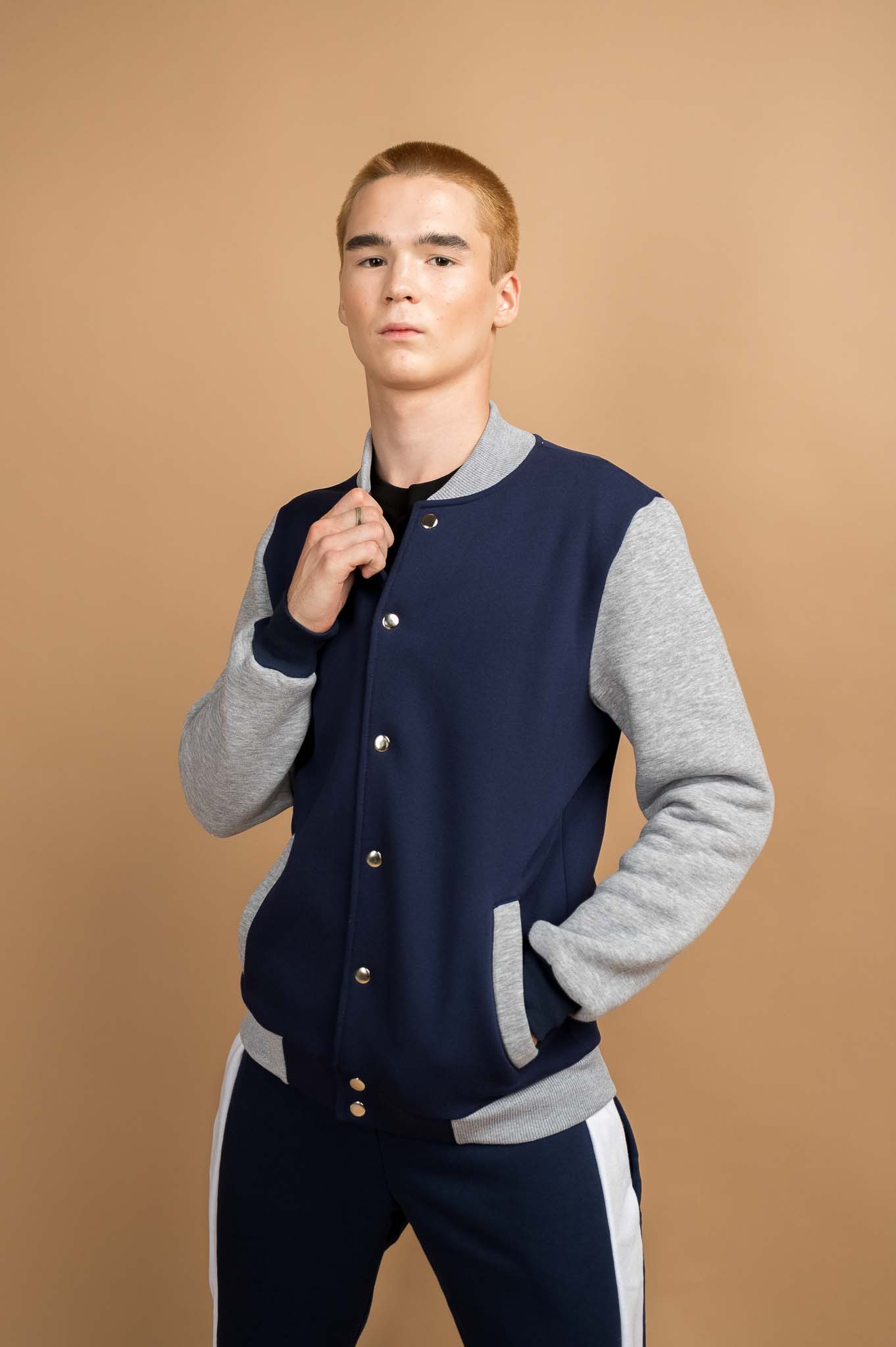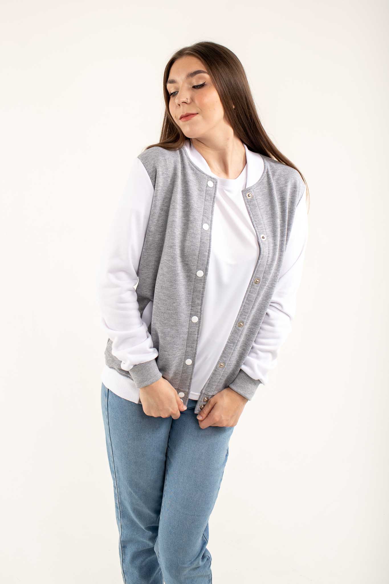 Классический Бомбер приталенного кроя с втачным рукавом с естественной линией плеча, на полочке прорезные карманы с листочкой, застежка цельнокроеная планка на металлических кнопках.