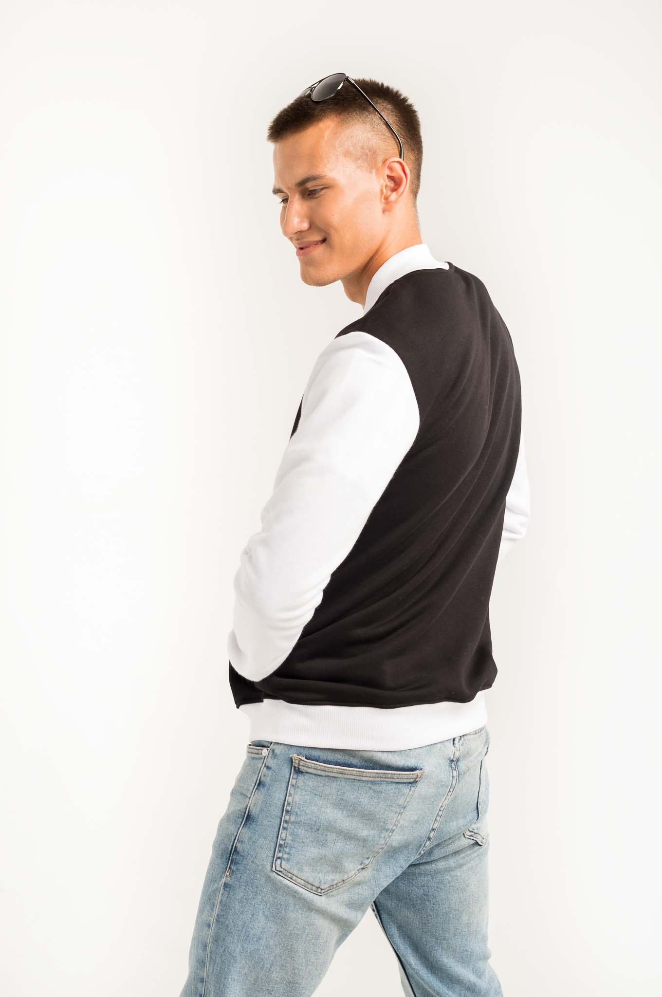 Классический Бомбер прямого кроя с втачным рукавом с естественной линией плеча, на полочке прорезные карманы с листочкой, застежка цельнокроеная планка на металлических кнопках. Воротник-стойка с фигурными концами из кашкорсе, низ рукавов обработан манжетой из кашкорсе, низ изделия закрыт поясом из кашкорсе. Шов втачивания воротника усилен киперной лентой, отстрочки шириной 0,5 см по краю планки и низу изделия, карманы отстрочены ш/ш 0,1 см. Длина изделия до середины бедер.