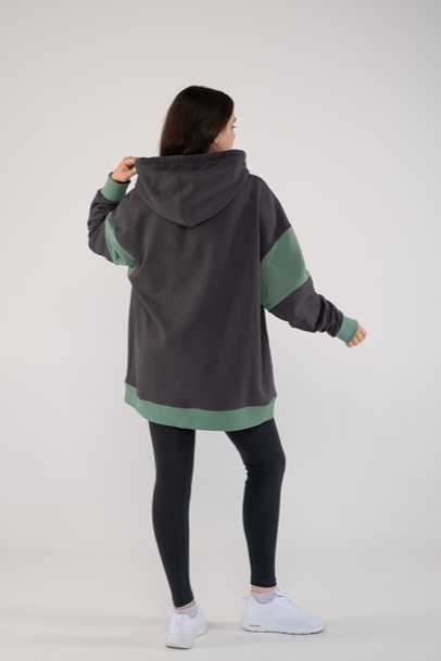 Низ изделия и рукава обработаны притачными манжетами из кашкорсе, что придает худи законченный и аккуратный вид. Отстрочка на специальной машине с раздвижкой шва по плечевому и пройме подчеркивает изящество и качество исполнения.